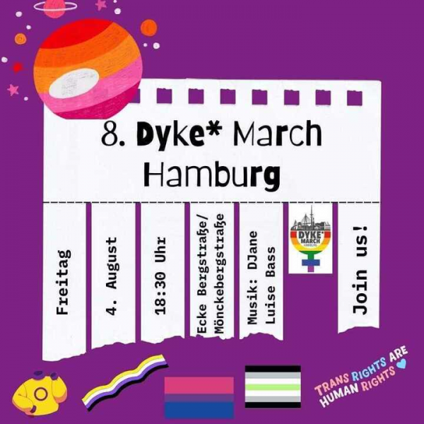 Am 4. August ist es wieder so weit: Das Lesbennetzwerk Hamburg ruft zum 8.Dyke* March für mehr Lesbische* Sichtbarkeiten auf.