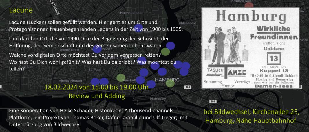 Lacune, das heißt historische Lücken in Hamburg sollen gefüllt werden. Eine Lakuna sind die Orte und Protagonistinnen frauenbegehrenden Lebens in der Zeit von 1900 bis 1935. Im Wesentlichen entnommen den damaligen Zeitschriften für und von frauenbegehrenden Frauen.