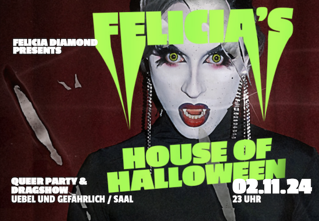 Am 2. November verwandelt sich das Uebel & Gefährlich in einen Ort des Schreckens und der sinnlichen Magie! Felicia’s House of Halloween öffnet Tür und Tore und möchte euch alle einladen daran teil zu haben, für die Most fu*king delicious Dragshow die Hamburg zu bieten hat! Diese Nacht wird heiß, wild und einfach unvergesslich! Seid Teil der ersten Halloween Edition der geilsten Indie-Pop-House-Dance-Queer-Party der ersten (und einzigen) Bürgermeisterin der Schanze: Felicia Diamond, die wieder acht der sensationellsten lokalen Drag Artists Hamburgs zusammen getrommelt hat, um gemeinsam mit ihnen die heißeste und blutigste Drag Show die Hamburg jemals gesehen hat, zu präsentieren!