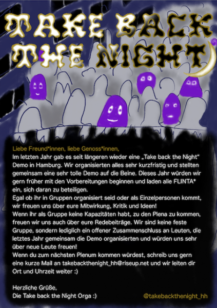 eine kurze Mail (takebackthenight_hh@riseup.net) und wir leiten euch Ort