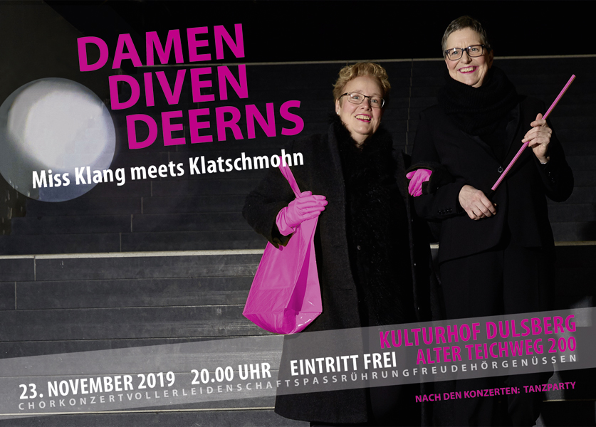 Der international bekannte queere Frauenchor „Miss Klang“ (Hamburg) besingt viele Leben voller Leidenschaften und verwandelt mit der Chorschwester „Klatschmohn“ (Weimar) die Bühne in ein Hörerlebnis voller Emotionen. Ein musikalisches Repertoire, was es in sich hat: a cappella, mit Klavierbegleitung und fein gespickten Choreografien … und das mit über 50 Damen, Diven und Deerns.