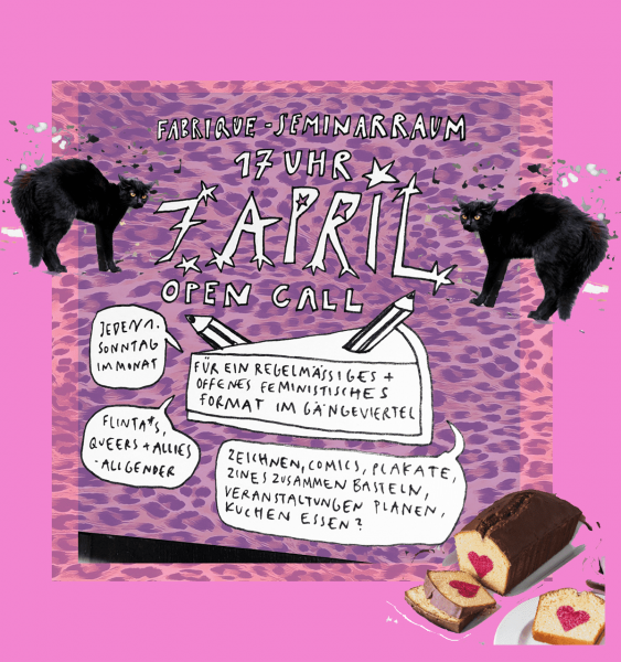 Der FLINTA*-Comic-Zeichentreff comicandcake hat lange Zeit über im Gängeviertel stattgefunden. Leider ist das Ganze jetzt im letzten Jahr etwas eingeschlafen. Einige Personen haben aber weiterhin richtig Lust, dass es ein regelmäßiges offenes feministisches Format im Gängeviertel gibt – und auch, das zum Beispiel mit Zeichnen, Comics, Plakate designen, Zines zusammenkopieren, Veranstaltungen, Ausstellungen planen oder Kuchen essen zu verbinden!