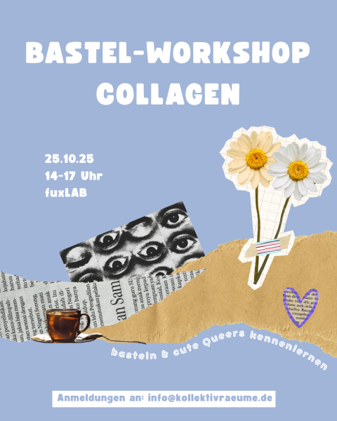 In unserem Bastel-Workshop laden wir euch ein, in entspannter Atmosphäre Collagen zu gestalten – alleine oder gemeinsam, mit Musik, Kakao und Keksen. Im Mittelpunkt steht das Thema Interaktion im weitesten Sinne. Der Workshop ist offen für alle, die Lust auf Austausch, Kreativität und herbstliche Gemütlichkeit haben. Materialien sind vorhanden, Teilnahme auf Spendenbasis. Der Workshop steht allen offen, die sich selbst als queer verstehen. Testet euch gerne vorher auf Corona und kommt bitte nicht, wenn ihr erkältet seid. Anmeldungen bitte per Mail an: info@kollektivraeume.de