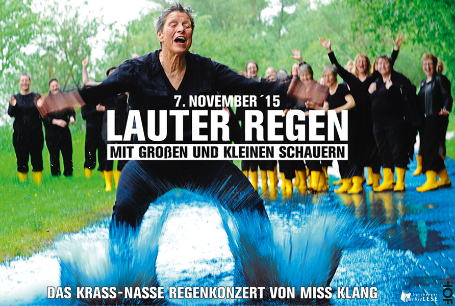 Mit Lauter Regen betritt Miss Klang (der große gemischte Frauenchor aus Hamburg) in gelbem Gummistiefeloutfit die Bühne und präsentiert